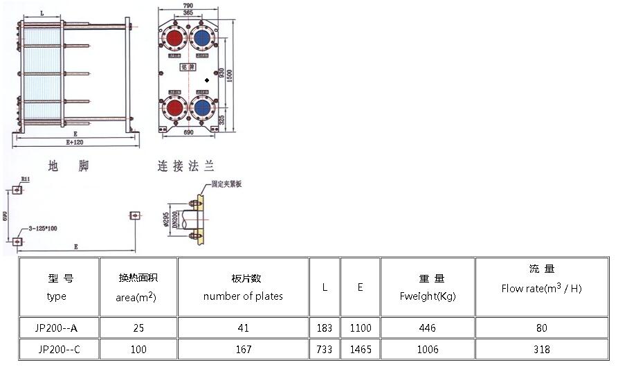 ◆A为组装面积,C为组装面积。 ◆压紧尺寸L(mm):L=(4.4±0.2 ) x 板片数 ◆水流量是按单流程、板问流速为0.4m/s时计算的 ◆保留数据更改的权利,以上数据仅供参考,具体以实物为准 1、板式换热器介绍 板式换热器是由框架、传热板片组及夹紧螺栓等主要部件组成。 2、板式换热器板片材质: *不锈钢sus304 sus316l 净水、河川水、食物油、矿物油 *工业纯钛及钛钯合金ti tanium and pal ladium 海水、盐水、盐化物 *哈氏合金hadtelloy alloy 浓硫酸、盐酸、磷酸 *镍nickel 高温高浓度苛性钠 3、板式换热器垫片材质: *丁腈橡胶r 水、海水、矿物油、盐水 一15--1io~c *高温橡胶bnbr - 高温矿物油、高温水 15--140~c *三元乙丙epdm 热水、水蒸气、酸、碱 一25--150~c *氟橡胶 viton/fluorine rubber 强酸、强碱、矿物油、润滑脂和燃油等 一5--180~c *氯丁橡胶neoprene 酸、碱、矿物油、低分子量脂烃 一35--130~c *硅橡胶silicon rubber 高温和某些腐蚀性介质 一65-200℃ 4、板式换热器设计理念: *板片带有增压的新型导流区设计是在板片导流区流速的地方采用多路通道增加压力,使整张板片中的流速达到均等,提高了板片的换热效率,减少了死角,改善了板片的结垢状况。 *板片挂口设计是在挂口处增加花纹设计,翻边周围的刚性。 *板片中间部位板槽设计足把板片内部的连续波纹断开,并存板片i}l增加了半槽结构,缓和板片所承受的压力,使板片压制成形后更、卜整,小易弯曲。 *板片互锁设计是在板片的四角压制特殊的机械互锁结构,改善了板片组装过程中容易串位泄露的现象,使板片组装起来便捷、美观。 *板片密封垫片采用免粘贴搭扣形式,减少运行维护成本,便于维修。 5、板式换热器的技术优势和特点: *传热系数高:传热板片上的特殊波纹设计,可使流体在低的流速下产生强烈的湍流,湍流的自净效应又可防止污垢的产生,使得板式换热器的传热系数为管壳式换热器的3-5倍。 *经济性:相同换热量的前提下,与管壳式比较:投资少、运行费用低、维修费用低。 *可调整性:只需增加和减少板片即可满足工艺过程改变的需求。 *结构紧凑:在相同换热量的前提下,占用空间仅为管壳式的1/2一l/3 *易于洁洗维修 6、板式换热器设计选型: (1)冷、热介质的物性参数,如酸碱度、氯根含量、粘度、密度、导热系数、比热等。 (2)冷、热介质的进出口温度。 (3)冷、热介质的流量或其中一种的流量。 (4)冷、热介质压力损失要求。 (5)板式换热器固有特性,如板片材料、密封胶垫材料等。