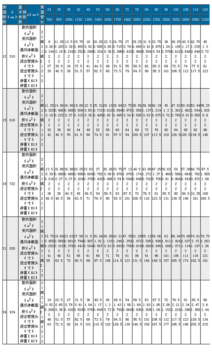 附 注: 1、表中散热面积系2R--翅片数据,若为其它情况卜则可用下列常数换算之: IR--翅片散热面积=2R--翅片散热面积×0.5 2M--翅片散热面积=2R--翅片散热面积×0.77 1M--翅儿散热面积=2R—翅片散热面积×0.385 2T--翅片散热面积=2R翅片散热面积×0.54 1T--翅片散热面积=2R--翅片散热面积×0.27 2、表中通风净截面积系根据种片距计算,若为其它片距,则可用下列常数换算之: M种片距通风净截面积=R种片距通风净截面积×1.015 T种片距通风净截面积=R种片距通风净截面积×1.035 3、表中净重系IR--翅片和2R--翅片的排管重量,若为其它片距,则可用下列常数换算之: 1M--翅片的排管净重=IR片距的排管净重× 0.94 2M--翅片的排管净重=2R翅片的排管净重×0.92 1T--翊片的排管净重=IR片距的排管净重× 0.85 2T--翅片的排管净重=2R翅片的排管净重×0.7